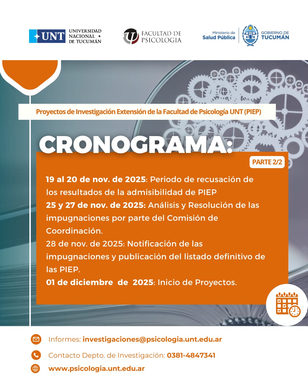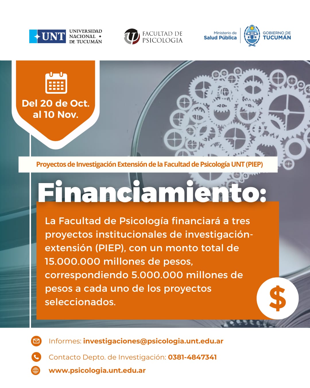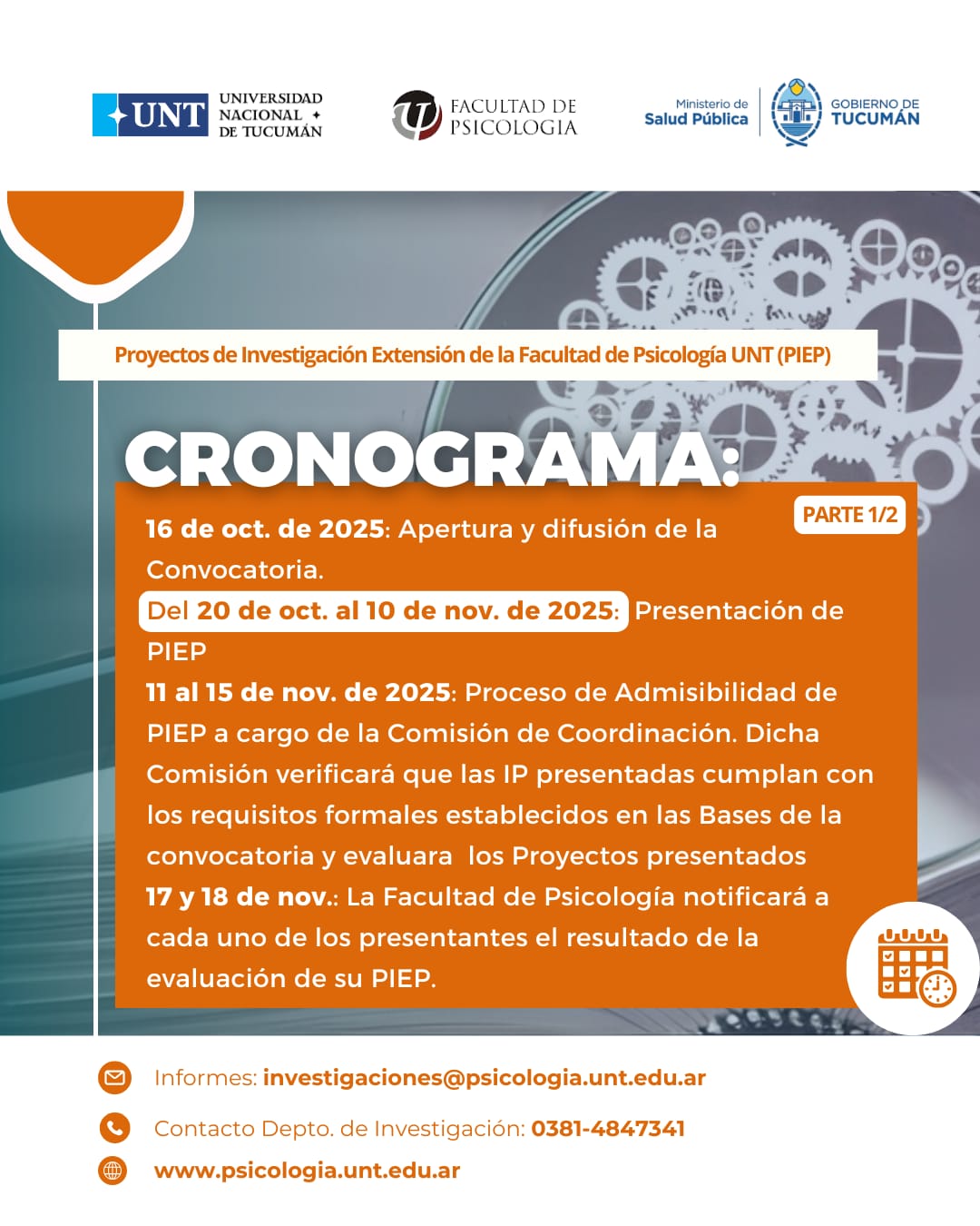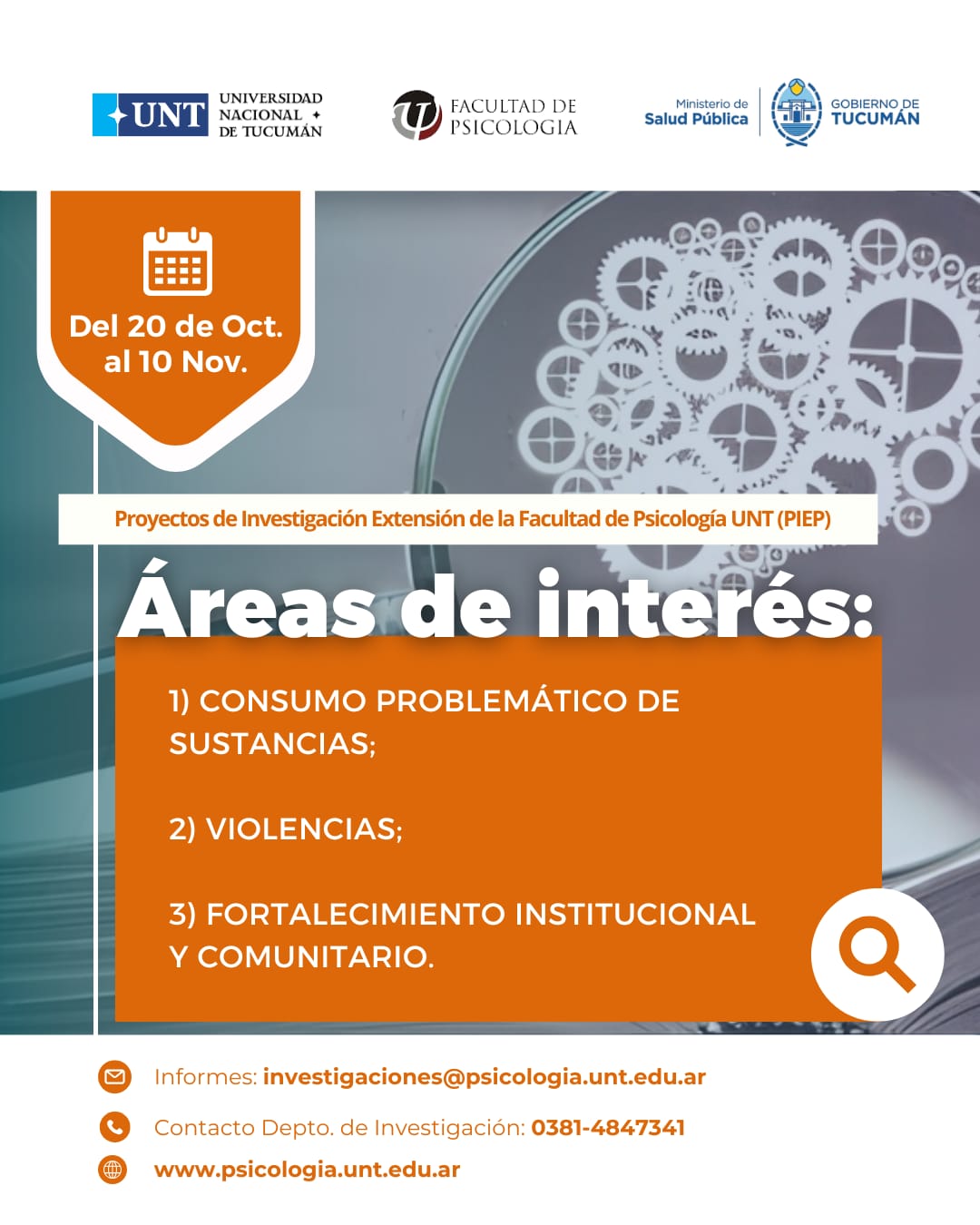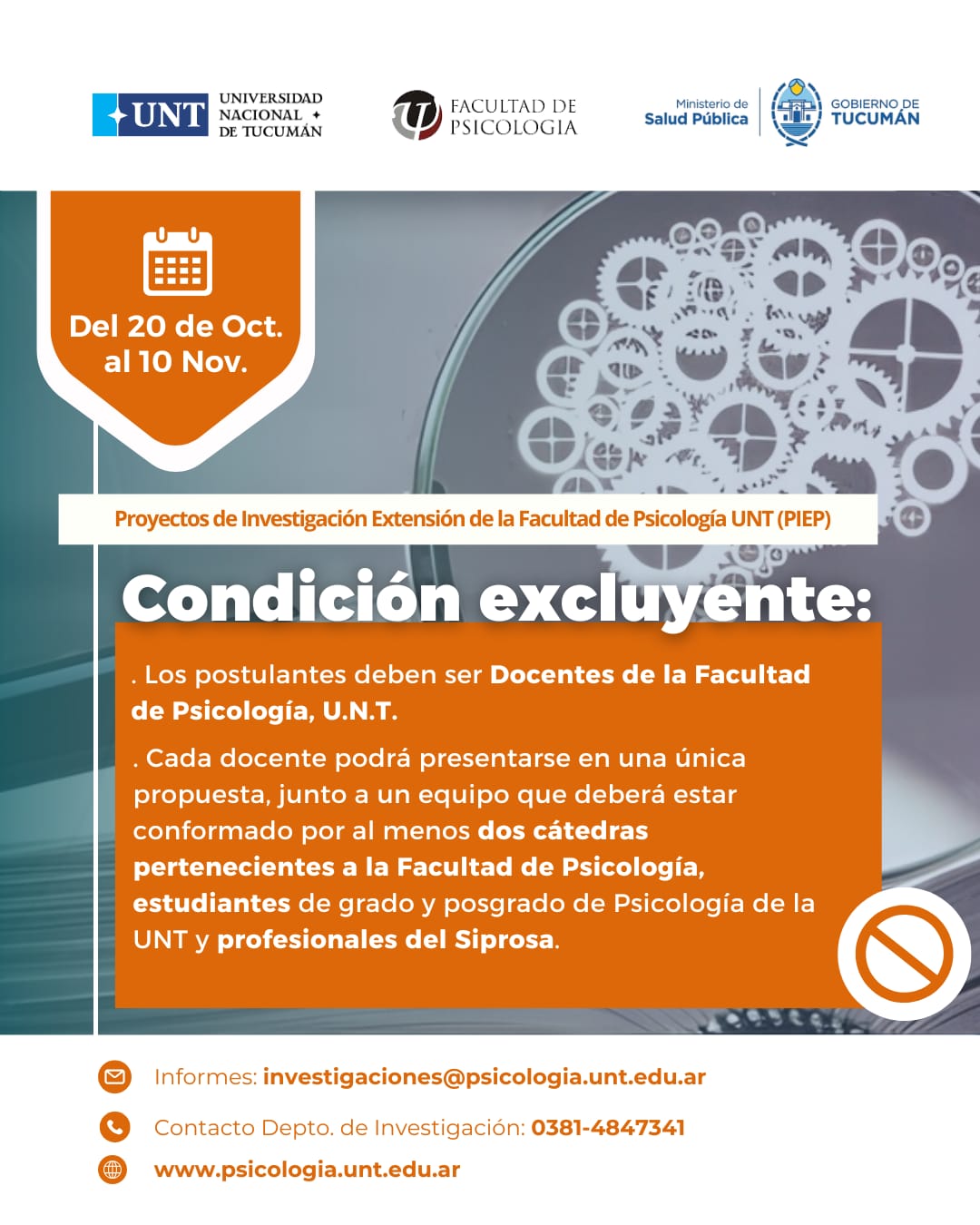 La Facultad de Psicología de la Universidad Nacional de Tucumán, en articulación con el Ministerio de Salud de la Provincia, lanzó la convocatoria UNTSALUD 2025-2026 para la presentación de Proyectos Institucionales de Investigación-Extensión en Psicología (PIEP).