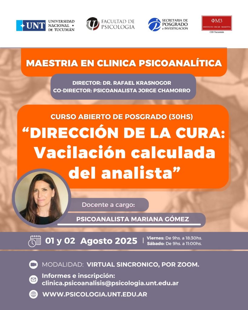 En esta oportunidad con la dirección de la Psicoanalista Mariana Gomez, la Maestría en Clínica Psicoanalítica, de la Facultad de Psicología de la UNT, junto al Instituto Oscar Masotta -Tucumán, presentan el curso abierto del mes de Agosto.