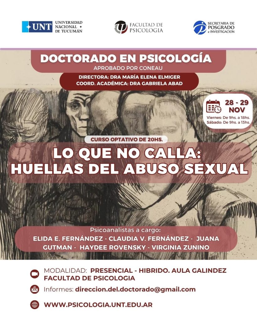 La Carrera de Doctorado en Psicología de la Facultad de Psicología de la Universidad Nacional de Tucumán invita a participar del curso de posgrado “Lo que no calla: huellas del abuso sexual”, que se dictará en modalidad virtual los días viernes 28 y sábado 29 de noviembre.